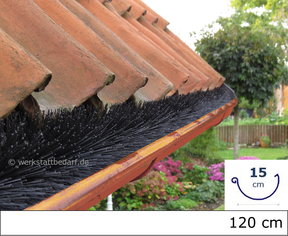 Die Bürste verhindert das Verstopfen der Dachrinne durch Laub. Feuchtes Laub wird zunächst vom Wind getrocknet und dann weggeweht. Außerdem gibt es keine Möglichkeit für Marder, Eichhörnchen oder Vögel, unter die Dachpfannen einzudringen.